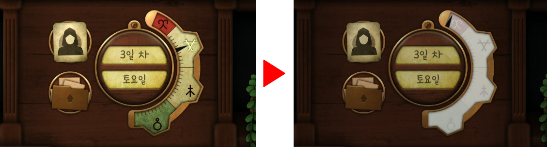 4. 같은 방법으로 나머지도 진행하면 세 개의 문양이 닫히면서 다시 직전의 게임 진행 상황으로 돌아갑니다. 다만, 주사위를 굴릴 때 아래의 이미지처럼 X가 나오는 주사위가 있으면 그만큼 왼쪽의 커서가 움직입니다. 이 커서가 3번 움직이면 다시 처음부터 주사위를 굴려야 합니다. 다행히 확정된 부분은 그대로 저장됩니다.