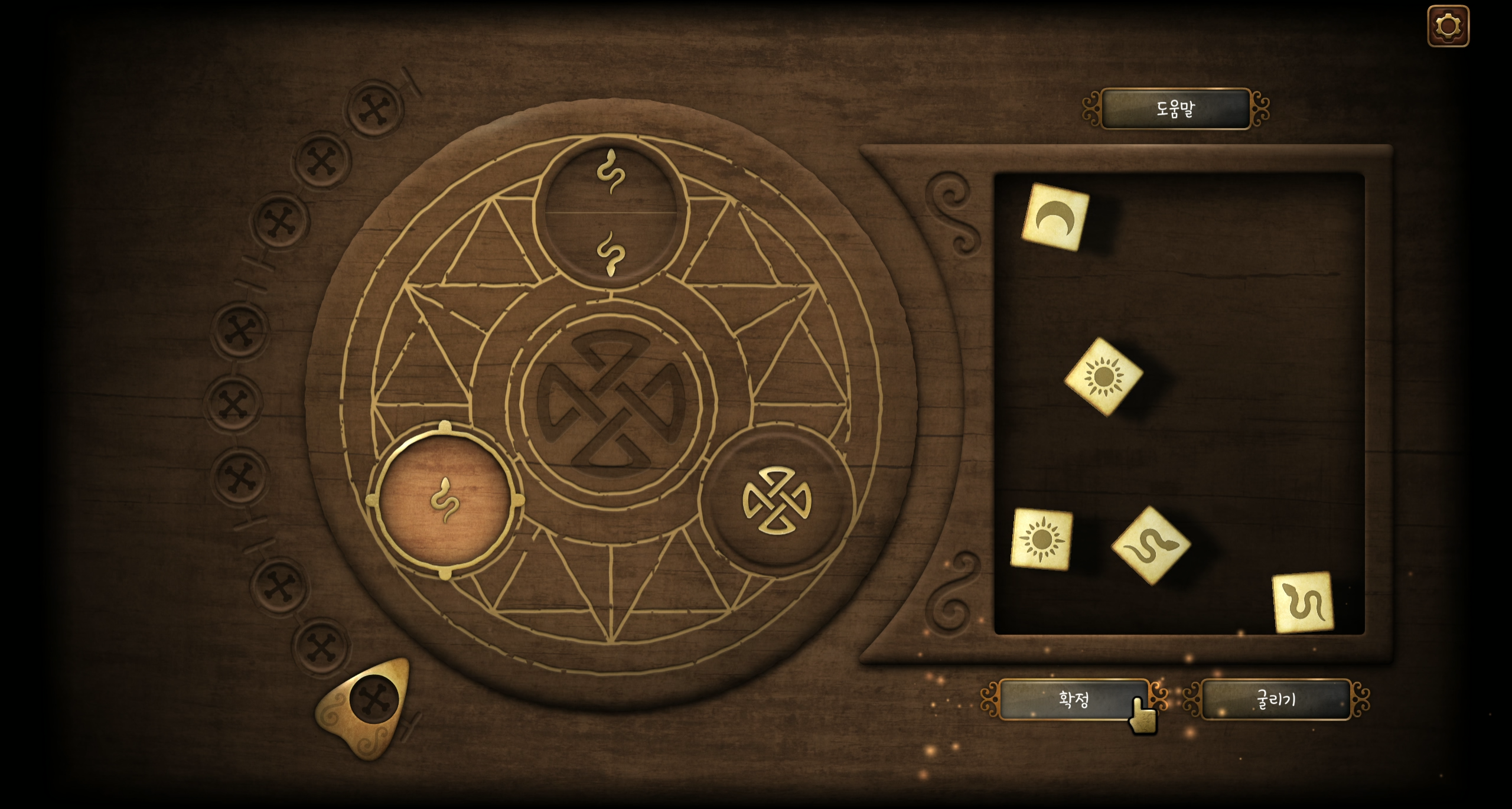 1. 왼쪽에는 문양이 그려진 3개의 원이 있고, 오른쪽에는 주사위판이 있습니다. 플레이어는 왼쪽의 주사위를 굴려 오른쪽의 문양을 만들어내는 것이 목표입니다. 아래의 이미지를 예로 들면, 뱀2마리, 뱀2마리, 무작위 같은 문양 2개, 이렇게 맞춰야 합니다.