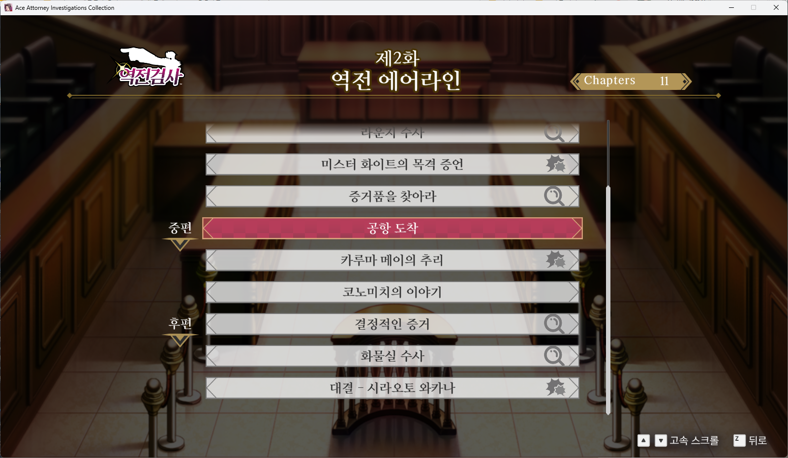 - [역전검사] - [제2화 역전 에어라인] - [공항 도착] 챕터를 선택합니다.
