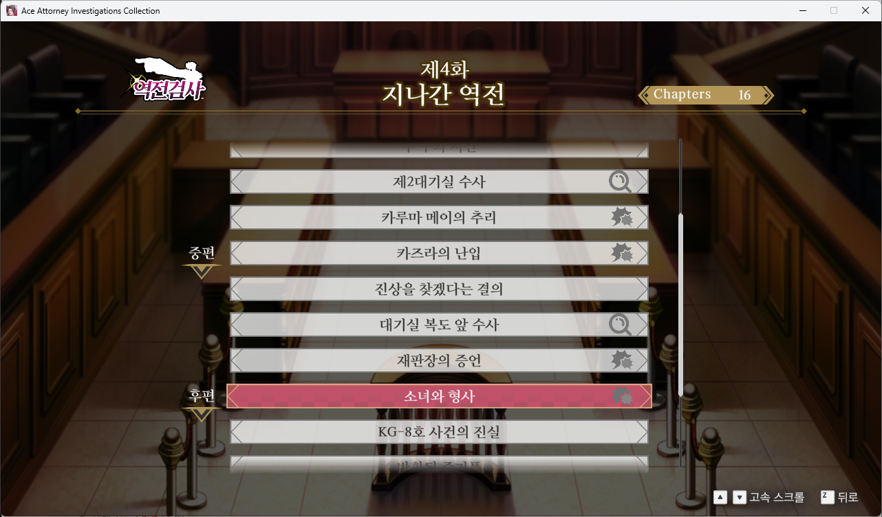 역전검사의 훈장 혹은 도전과제 목록입니다. 절반 정도는 튜토리얼과 스토리 클리어이므로 나머지는 챕터별로 별도 들어가서 특정 위치를 조사하거나 특정 대화를 하면 해금됩니다. 목차특정