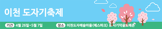 반도체(??)로 유명한 이천 역시 도자기 축제를 준비합니다. 4월 말부터 5월 초까지 12일간 '삼시세끼의 품격 이천 세라믹스'를 슬로건으로 다양한 프로그램을 선보입니다. 다양한 공연과 체험은 물론 전시와 판매가 준비되어 있습니다. 메인 행사장은 도자예술마을이며 사기막골도예촌에서는 체험행사 위주로 즐기실 수 있습니다. 어린이날에는 별도 기념이벤트도 있다고 합니다.