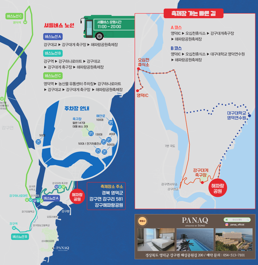 - 영덕시외버스터미널 ↔ 축제장: 15분 간격, 오전 7시부터 오후 10시까지 운행됩니다.