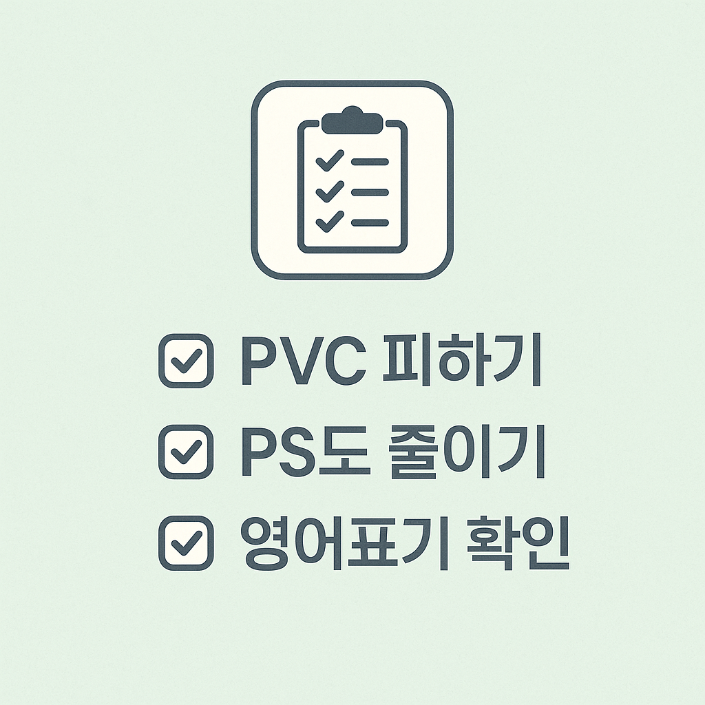 - 재활용 마크는 한글 대신 영어(PVC, PS) 로 표시된 경우가 많습니다. 구입할 때 꼭 확인하세요!