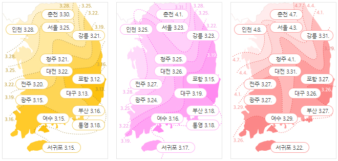 마스크 착용 원칙도 점점 완화되고 있습니다. 다시 외식과 여행이 생활로 돌아오고 있습니다. 관광지에 가면 점점 심심찮게 등산회가 대절한 관광버스들이 많이 보입니다. 이제 점점 전국에 꽃이 개화할 때가 되었습니다. 3월 26일 기준으로 보았을 때 개나리는 보기 쉬웠지만 그 외 벚꽃은 좀 더 기다려야 하는 상황인 거 같은데요. 어디론가 갈 계획을 아직도 못 세우셨다면 가장 가까운 축제 일정부터 체크해보세요!