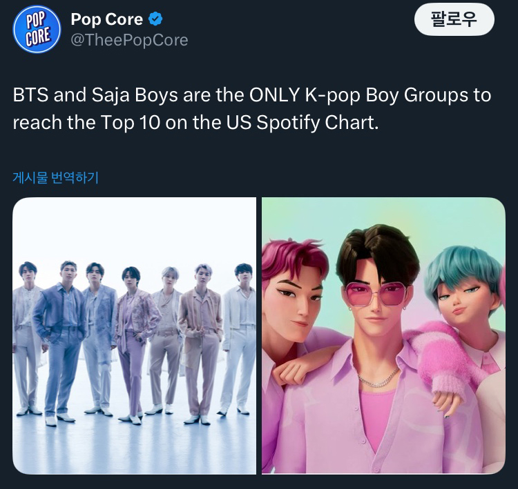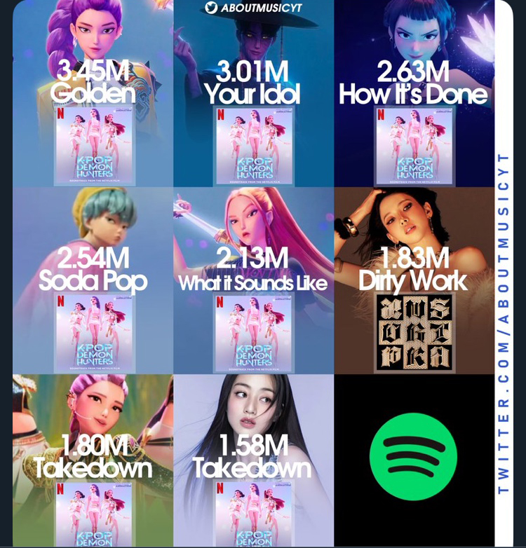 이미 iTunes에서는 1위를 하고 있었고, 스포티파이에서도 계속 순위권으로 올라가고 있습니다. K팝이 장르의 하나로 인식된 지 이미 오래되었기 때문에, OST자체가 거의 K팝 앨범으로 인식되고 있었습니다. 음악 전문 X(구. 트위터) 계정인 AboutMusic에 의하면 29일 기준 글로벌 스포티파이에서 가장 많이 스트리밍 된 K팝 곡이 순서대로 Golden, Your Idol, How It's Done, Soda Pop, What It Sounds Like였습니다. 또 다른 음악 전문 X 계정인 Pop Core에서는 미국 스포티파이 차트에 Top 10 안에 진입한 K팝 보이그룹이 방탄소년단과 사자보이즈 둘 뿐이라고 언급했습니다. 미국 애니메이션의 OST, 심지어 K팝인 음악이 전 세계 사람들을 사로잡고 있다는 방증입니다.