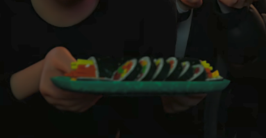 김밥이 담긴 그릇은 옛날 분식집에서 자주 보이던 초록 접시. 소품까지 한국 고증 충실!