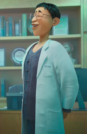 한의원 의사는 생활한복 위에 가운을 걸친 복장을 하고 있습니다.