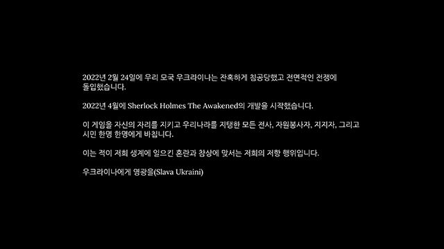 2022년 2월 24일, 갑작스런 침공 소식을 접했습니다. 그로부터 약 2달 후, 스튜디오는 차기작 개발을 시작하였습니다. 그것이 바로 이 Sherlock Holmes: The Awakened (이하 "어웨이큰드") 입니다. 2007년에 발매했던 옛 작품을 새롭게 리부트 한 시리즈에 맞게 리메이크하는 것이었습니다.