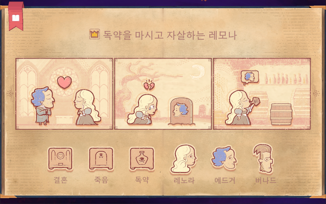 - 1장 : 삶과 죽음 - 튜토리얼 개념이므로 게임 진행 방식을 알려주는 장입니다. 1-1. 사랑 : 외로웠지만 사랑을 찾아 행복하게 죽음을 맞이하는 아담 1-2. 비탄 : 아담과 사별하고 상심한 채로 죽음