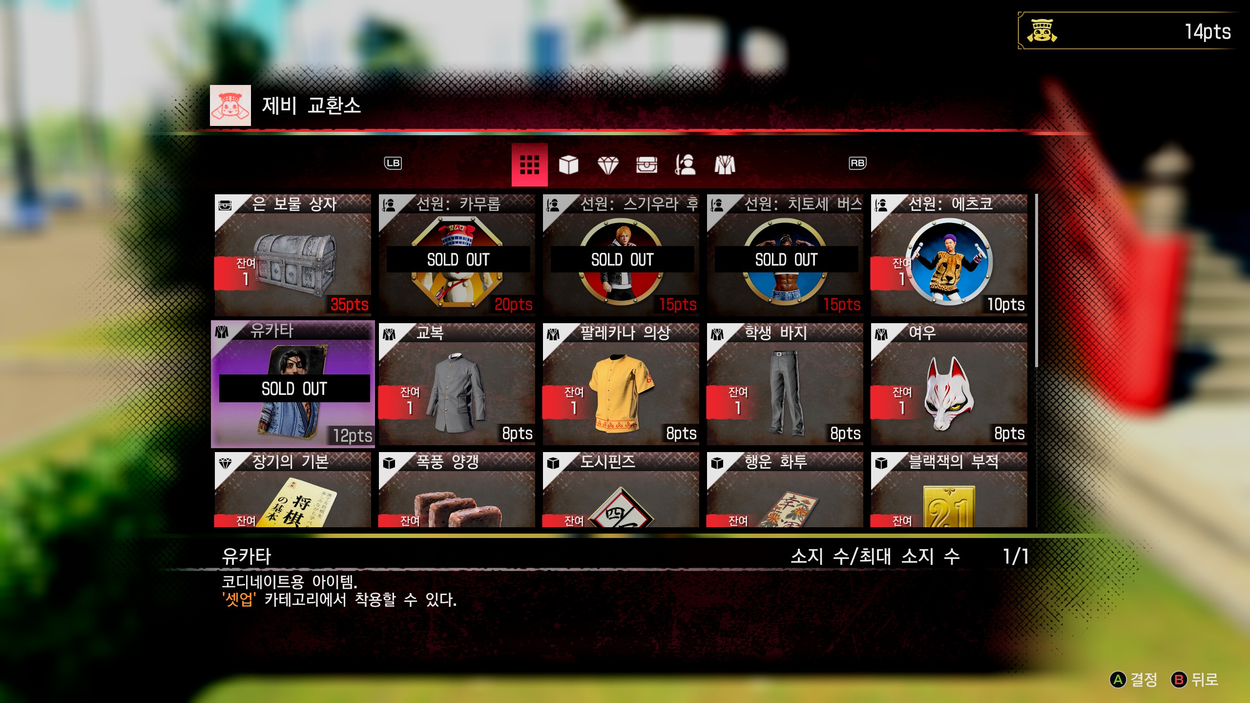 직접 아이템을 사는 것 말고도 이미 세팅되어 있는 코스튬이 있습니다. 게임 내에서 제공하는 것도 있고, DLC를 구매하면 적용할 수 있는 것들도 있습니다. 7 주인공 카스가의 코스튬이나, 키류 카즈마의 회색 양복의 경우 초기 특전으로 내줬기 때문에 이미 갖고 계신 분들도 계실 겁니다. 못 얻었더라도 DLC를 통해 구매하실 수 있습니다.